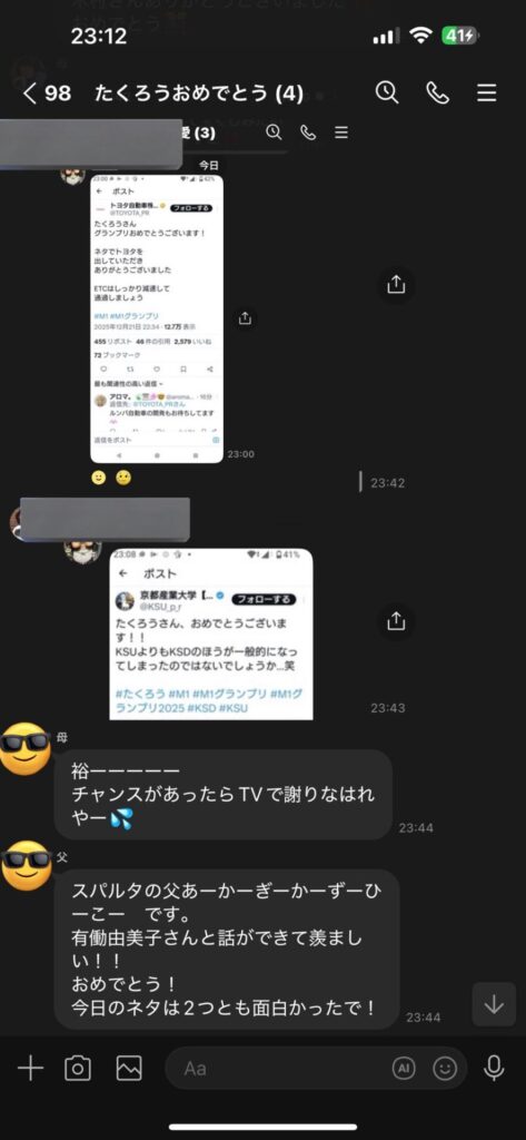 M1優勝後に出演した番組でエピソードを披露した際にお父様のお名前が公表されてしまう事態が!!(笑)