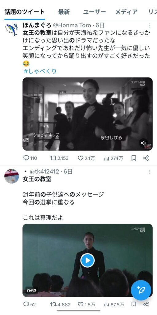 Xで天海祐希さんを検索した際に圧倒的に多いのが、「女王の教室」のきりっとした姿。ドラマのセリフなのに、天海祐希さん本人から発されているような言葉にも聞こえるシーンがたくさんありますよね。