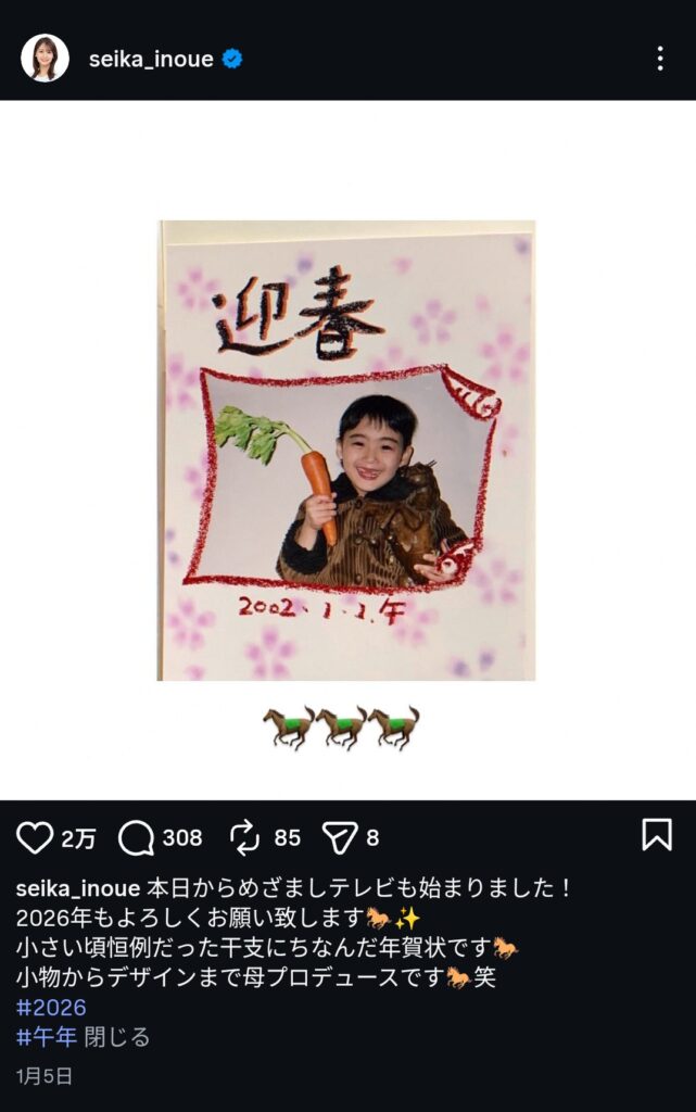 井上清華さんはインスタグラムを個人でアカウント持たれています。年始には1件投稿をアップされていました。