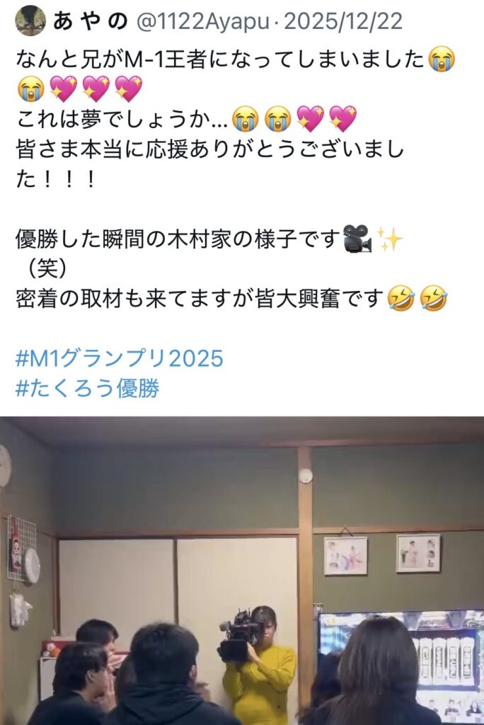 きむらバンドの妹はM-1優勝当日についてXで投稿