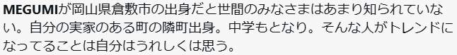 MEGUMIさんのプロフィールには岡山県倉敷市出身と明記されています。