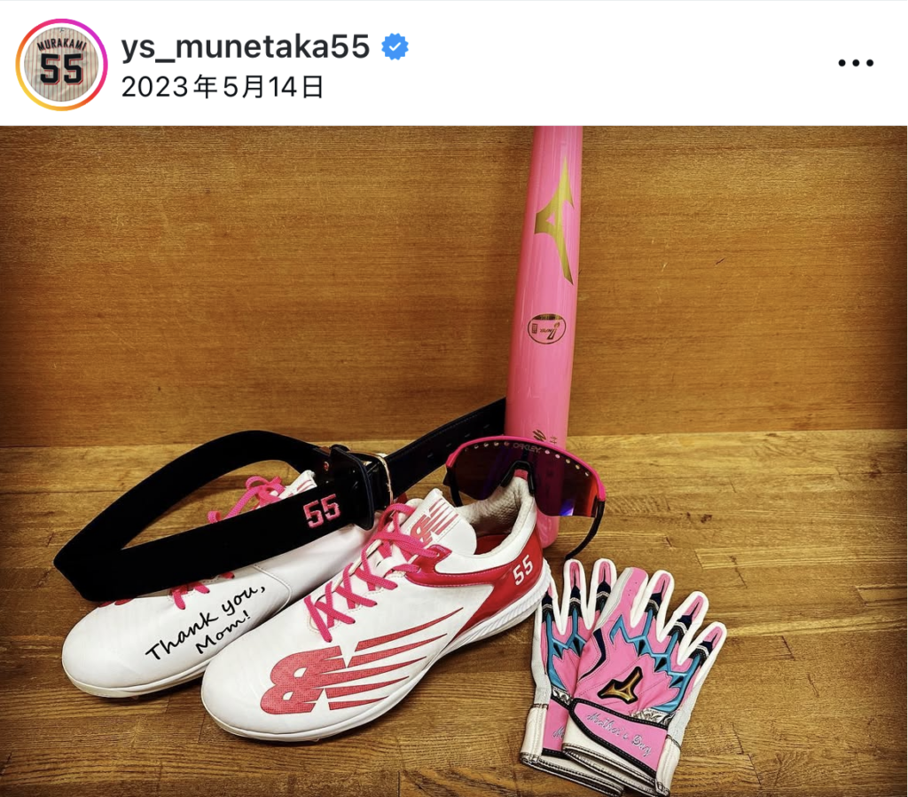 村上宗隆選手も、ピンクのスパイクとサングラスを着用して参加しました。