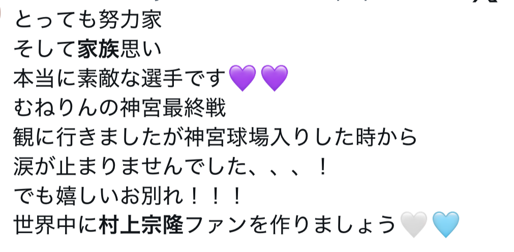 村上宗隆選手の家族思いな姿はファンにも伝わっているようです。