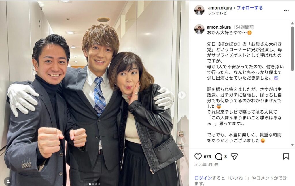 フジテレビ系の番組『ぽかぽか』内の “お母さん大好き党” という企画に出演し、大倉士門さんとお母さんは一緒の画面に登場したようです。