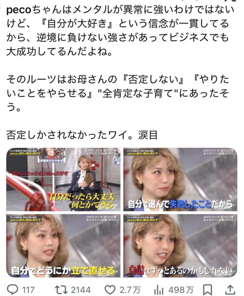 ぺこさんの明るさや前向きな姿勢、そして自分らしさを大切にする生き方は、裕福な環境だけでなく、愛情深く、子どもを信じて応援してくれる奥平家の家族の存在があってこそ形成されたものだと言えるでしょう。