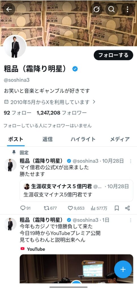 Xでも強火の言葉をつぶやいたり、ギャンブルの収支などを報告されています。