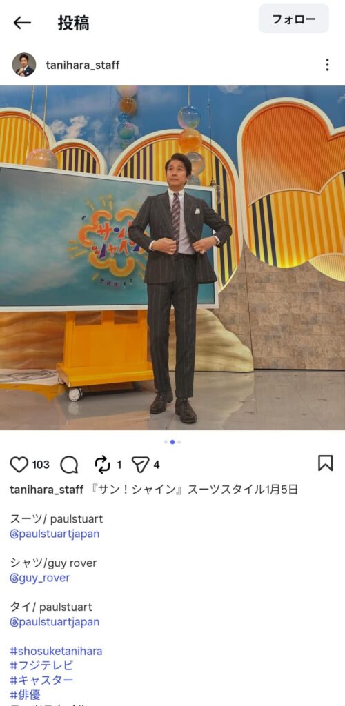 谷原さんが着こなされているスーツやそのほかのブランドなどもわかるようです♪