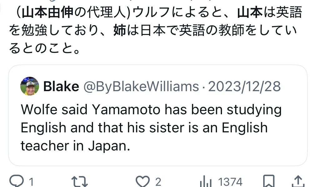 山本由伸選手の姉は英語教師で国際結婚しているそうです。