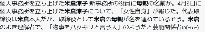 新事務所を立ち上げた米倉涼子さんは取締役に自分の母親が就任しました。